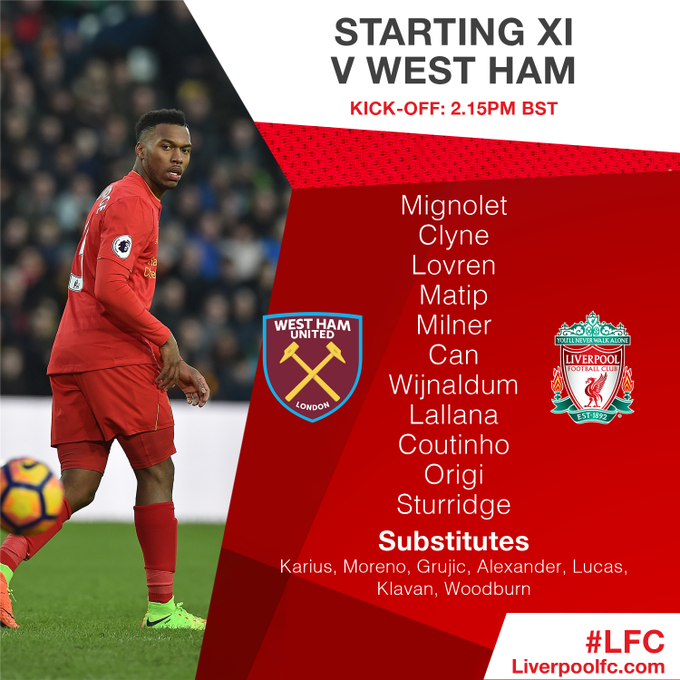 TEAM NEWS West Ham vs Liverpool team news: Daniel Sturridge starts with Roberto